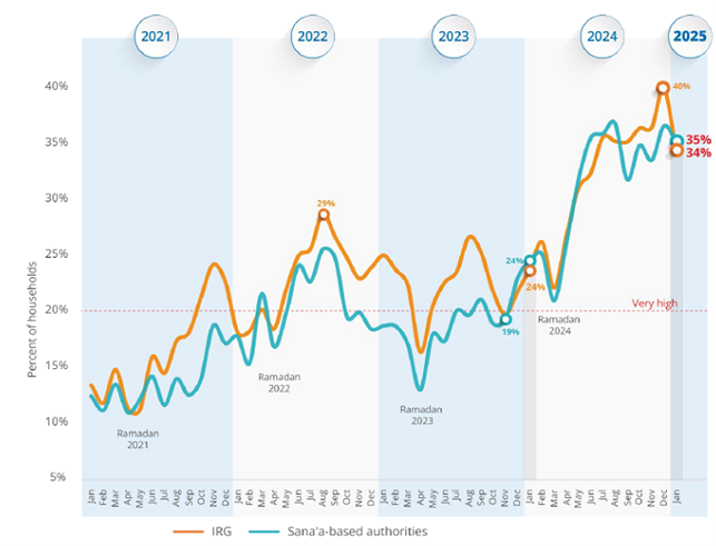 وقال: إن مستويات الحرمان الغذائي الشديدة (سوء استهلاك الغذاء) ظلت عند مستويات مثيرة للقلق في يناير (34% في المناطق الخاضعة لحكومة اليمن المعترف بها دوليًا و35% في المناطق الخاضعة لسلطات صنعاء)، وإن كانت تظهر انخفاضًا شهريًا بنسبة 14% في المناطق الخاضعة لحكومة اليمن المعترف بها دوليًا و4% في المناطق الخاضعة لسلطات صنعاء.
