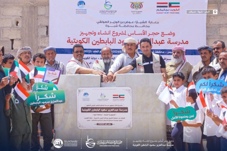 مؤسسة استجابة للأعمال الإنسانية والإغاثية بتمويل كويتي، وضع حجر الأساس لمشروع انشاء وتجهيز مدرسة سعود عبدالعزيز البابطين الكويتية بمديرية عسيلان محافظة شبوة يوليو 13, 2024 لا توجد تعليقات