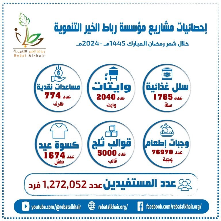 إحصائيات مشاريع مؤسسة رباط الخير التنموية خلال شهر رمضان المبارك 1445هـ-2024 أبريل 26, 2024 لا توجد تعليقات