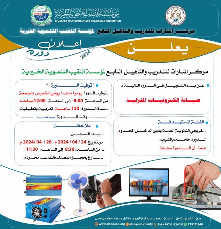 مؤسسة النقيب التنموية الخيرية إعــــــــــــــــلان دورة (فرصة ذهبية مجانية) أبريل 23, 2024 لا توجد تعليقات