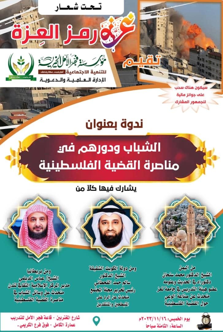 تحت شعار غزة رمز العزة تقيم الادارة العلمية والدعوية بمؤسسة فجر الامل الخيرية للتنمية الإجتماعية ندوة بعنوان الشباب ودورهم في مناصرة القضية الفلسطينية يشارك فيها