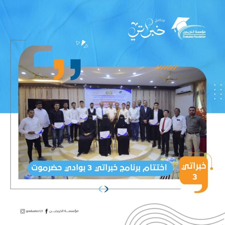 برعاية كريمة من السلطة المحلية بوادي حضرموت، وسفير النوايا الحسنة الدكتور عمر عبدالله بامحسون أختتمت مؤسسة الخريجين صباح الأحد بقاعة المرأة، والطفل برنامج خبراتي في