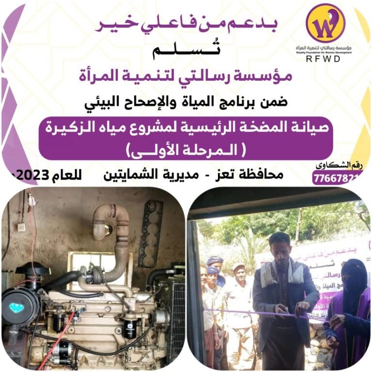 سلمت مؤسسة رسالتي لتنمية المرأة في تعز -منطقة الزكيرة مشروع مياه الزكيرة بعد إعادة تأهيل وصيانة المضخة الرئيسية فيه ،بدعم كريم من فاعلي خير حفظهم