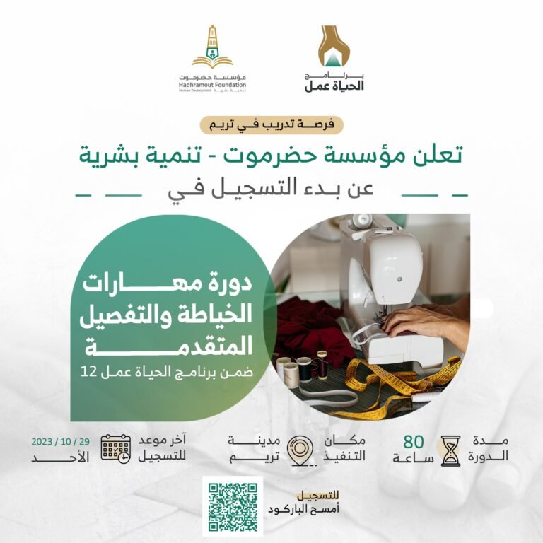 فرصة تدريب للنساء والفتيات في مدينة تريم الراغبات في تطوير مهاراتهن المهنية وفتح مشاريعهن الخاصة في مجال الخياطة والتفصيل: تعلن مؤسسة حضرموت تنمية بشرية عن