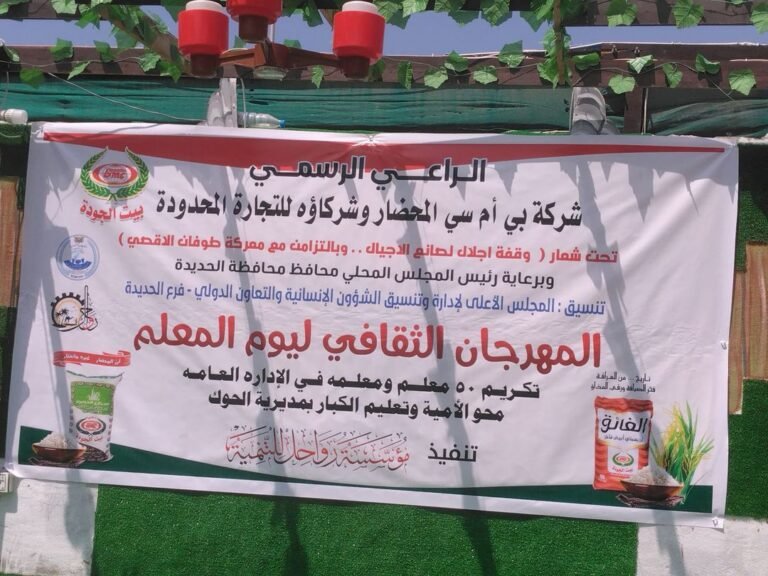 برعاية محافظ محافظة الحديدة اللواء محمد عياش قحيم وتحت شعار” وقفة اجلال لصانع الاجيال “ بالتزامن مع عملية طوفان الأقصى، نُظم عصر الأربعاء, 25-أكتوبر-2023م، مهرجاناً