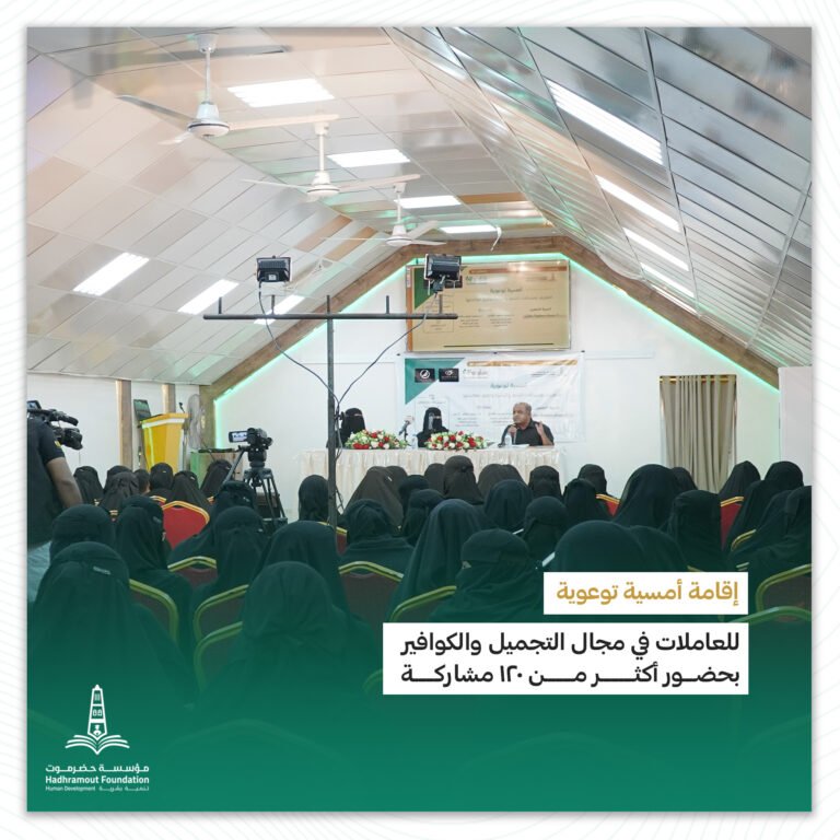 رعت مؤسسة حضرموت – تنمية بشرية إقامة أمسية توعوية مساء يوم الخميس ١٩ أكتوبر ٢٠٢٣م، بعنوان “مشكلات الشعر والبشرة وطرق معالجتها” في نادي متطوعون بالمكلا،