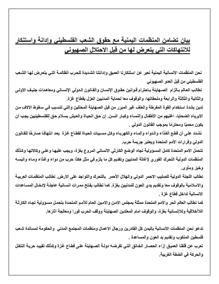 منظمات المجتمع المدني فى اليمن تصدر بيان تضامن مع حقوق الشعب الفلسطيني، نص البيان: