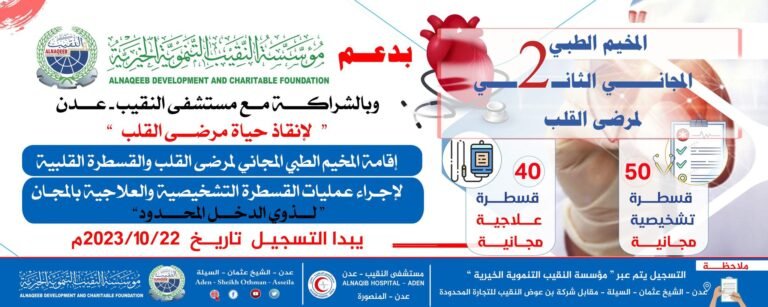 المخيم الطبي المجاني الثاني لمرضى القلب تحت عنوان “لإنقاذ حياة مرضى القلب” وبدعم مؤسسة النقيب التنموية الخيرية وبالشراكة مع مستشفى النقيب – عدن، تعلن عن