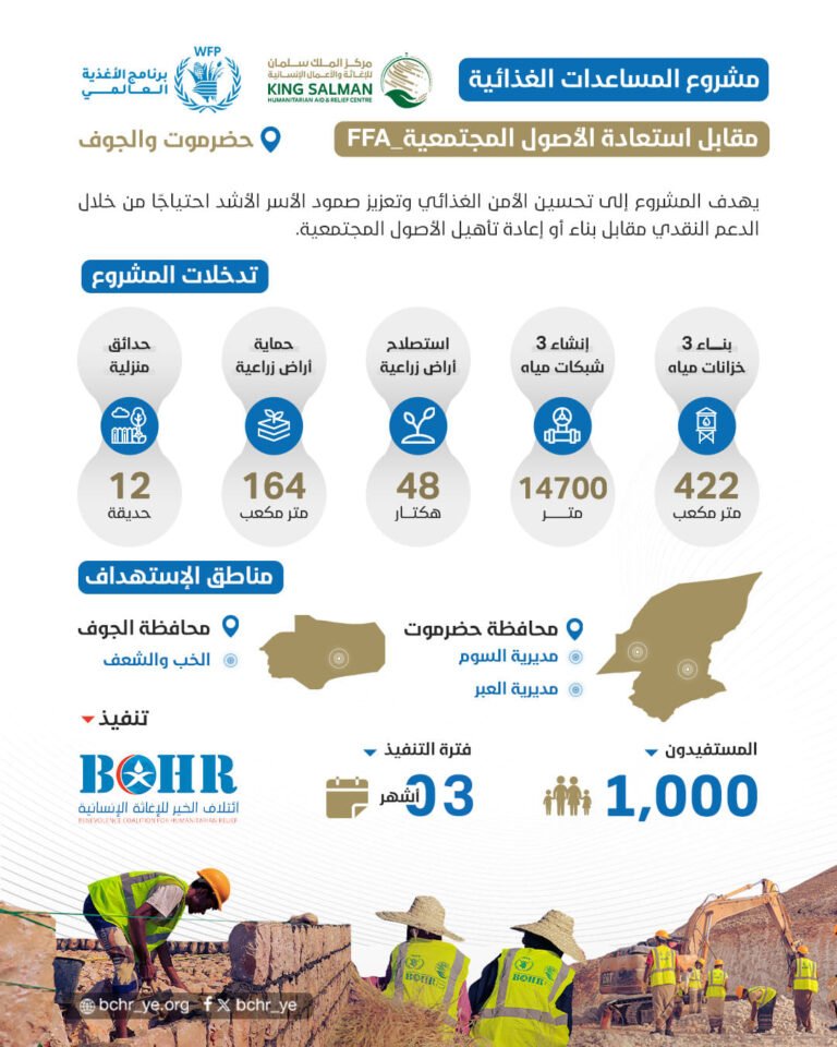 بتمويل من مركز الملك سلمان وبالشراكة مع برنامج الأغذية العالمي WFP.. يواصل ائتلاف الخير مشروع المساعدات الغذائية مقابل استعادة الأصول المجتمعية FFA في محافظتي حضرموت والجوف