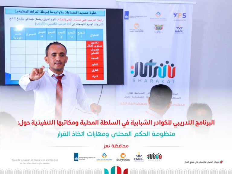 دشنت في وقت سابق منظمة وصل للسلام البرنامج التدريبي الذي يهدف لبناء قدرات القيادات الشبابية في هيكل السلطة المحلية ومكاتبها التنفيذية في محافظة تعز، برعاية