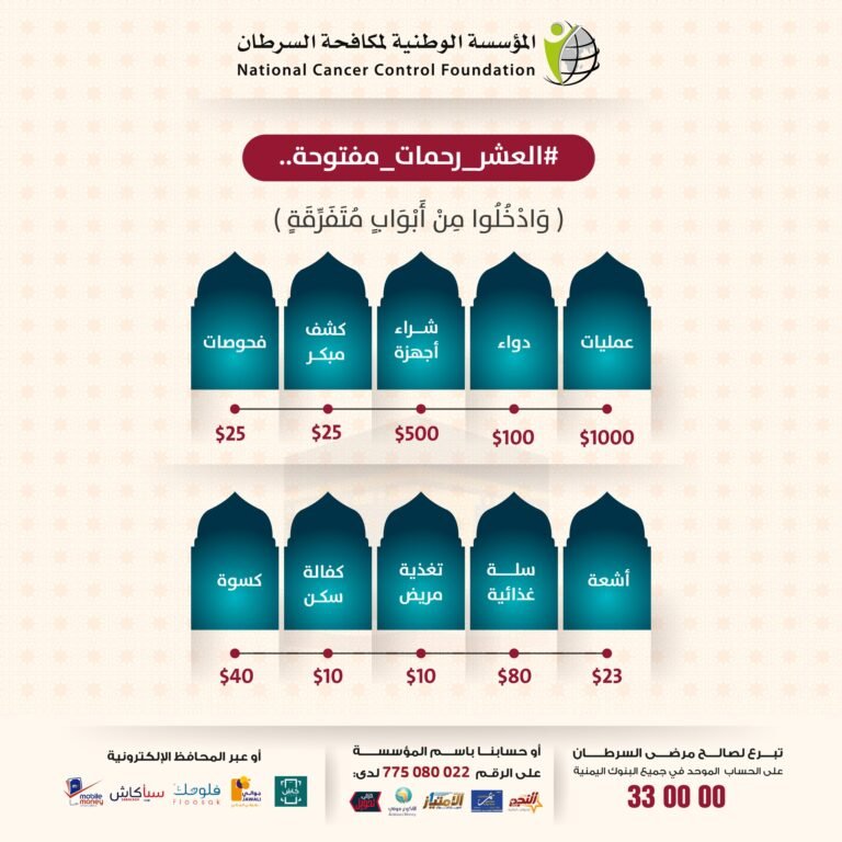 تحت شعار” العشررحمات مفتوحة، وادخلوا من أبوب متفرقة” أطلقت المؤسسة الوطنية لمكافحة السرطان ممثلة بمركزها الرئيسي بالعاصمة صنعاء عصر اليوم الاثنين حملتها الإلكترونية الخيرية الخاصة