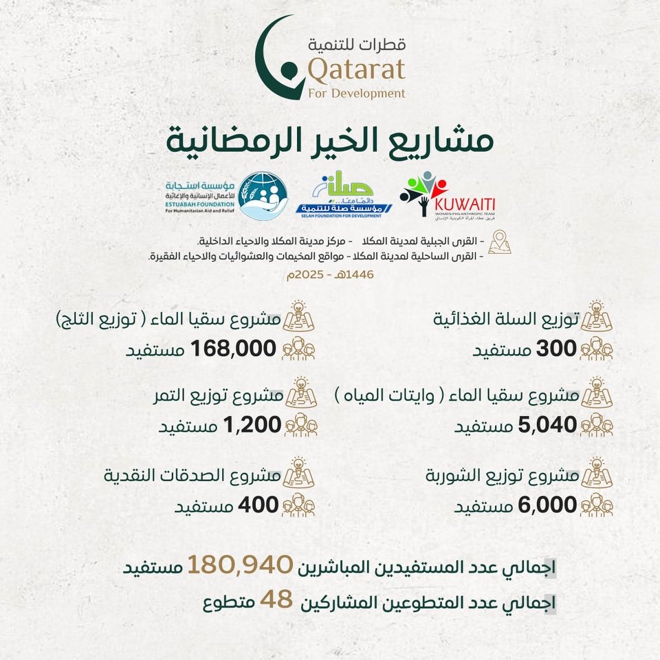 قطرات للتنمية حصاد عطائكم في مشاريع الخير الرمضانية 1446هـ اترك تعليقاً / بواسطة admin / أبريل 25, 2025 رمضان شهر الخير وهو الوقت الذي يزداد فيه الخير والعطاء اليكم حصاد عطائكم في مشاريع الخير الرمضانية استطعنا ان نكون عونًا لأكثر من 180 الف شخص في شهر الخير من خلال المشاريع الخير الرمضانية ——————– المصدر: قطرات للتنمية Qatarat for Development