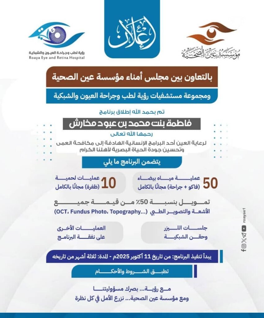 مؤسسة عين الصحية إطلاق برنامج فاطمة بنت محمد بن عبود مخارش – رحمها الله لرعاية العيون اترك تعليقاً / الوضع الاجتماعي / admin مؤسسة عين الصحية إطلاق برنامج فاطمة بنت محمد بن عبود مخارش – رحمها الله لرعاية العيون قراءة المزيد »