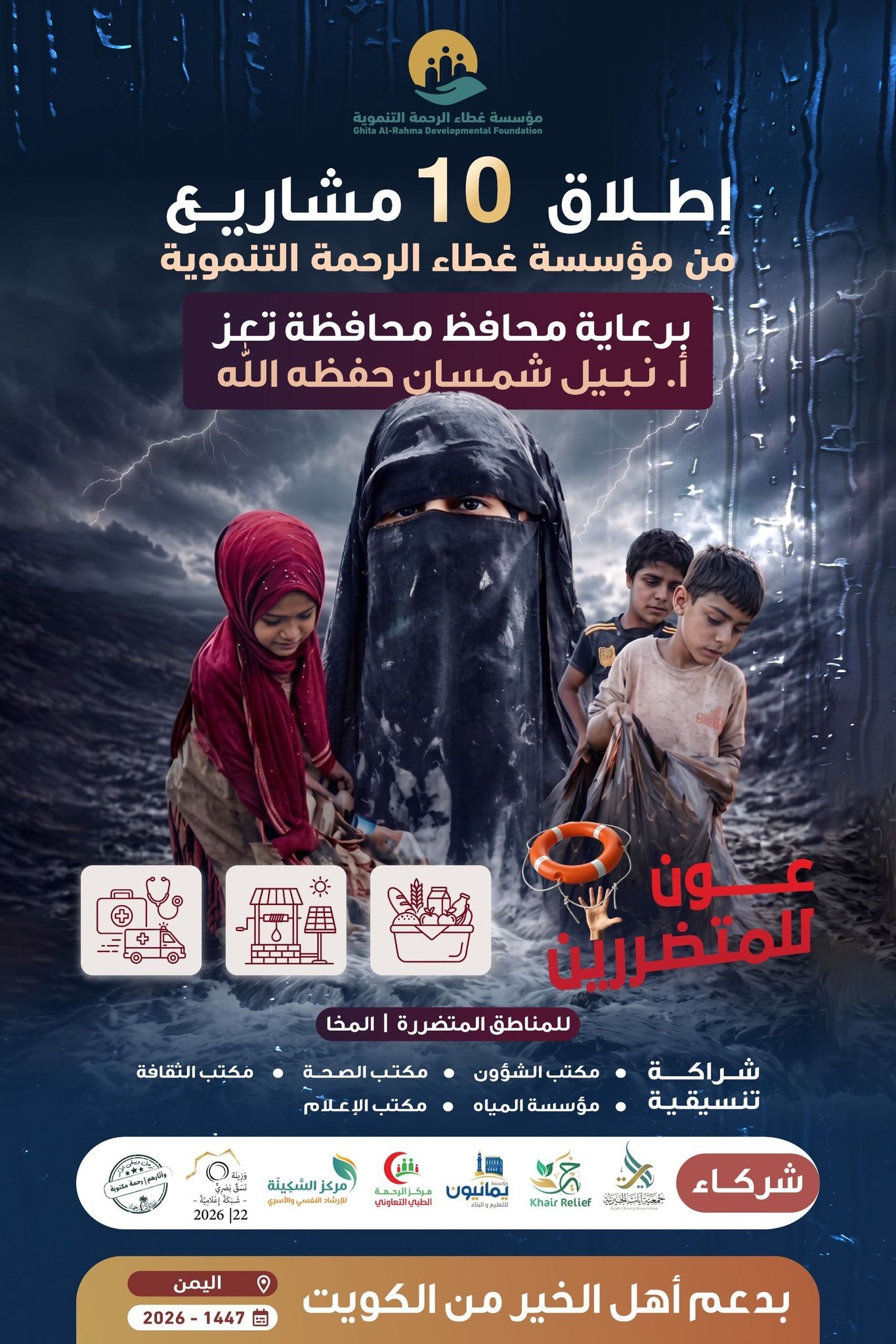 أُقيمت بمحافظة تعز فعالية تدشين حملة “عون” لإغاثة المتضررين من كوارث السيول، والتي تنفذها مؤسسة غطاء الرحمة التنموية برعاية محافظ المحافظة الأستاذ نبيل شمسان، وبدعم كريم من الأشقاء في دولة الكويت، وبالتنسيق مع عدد من المكاتب التنفيذية والجهات ذات العلاقة. ومن المقرر تنفيذ مشاريع الحملة في مديرية المخا، مستهدفة الأسر الأشد تضررًا.